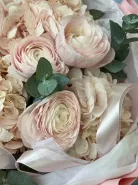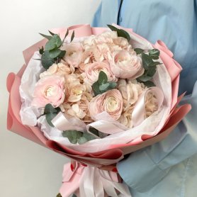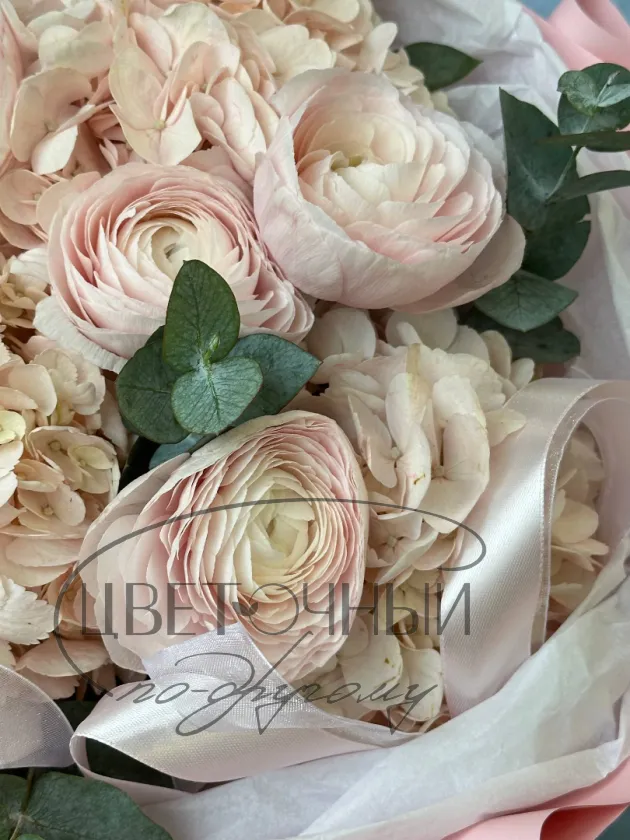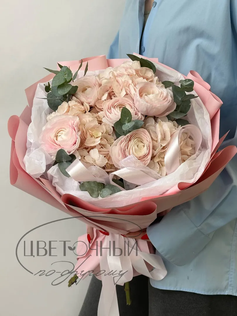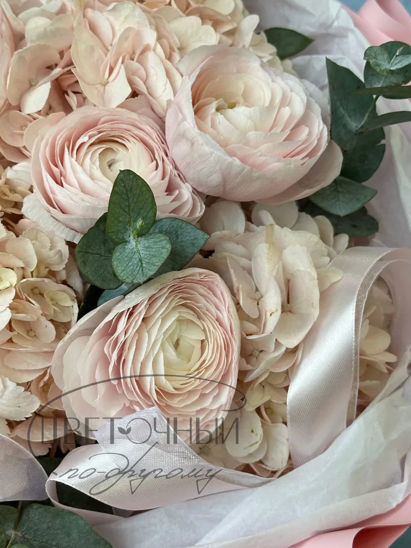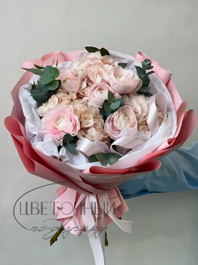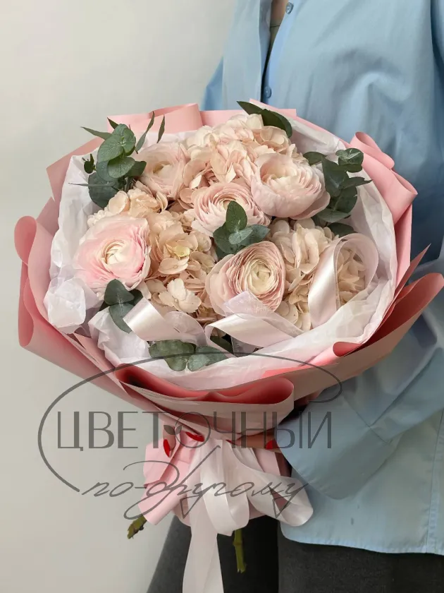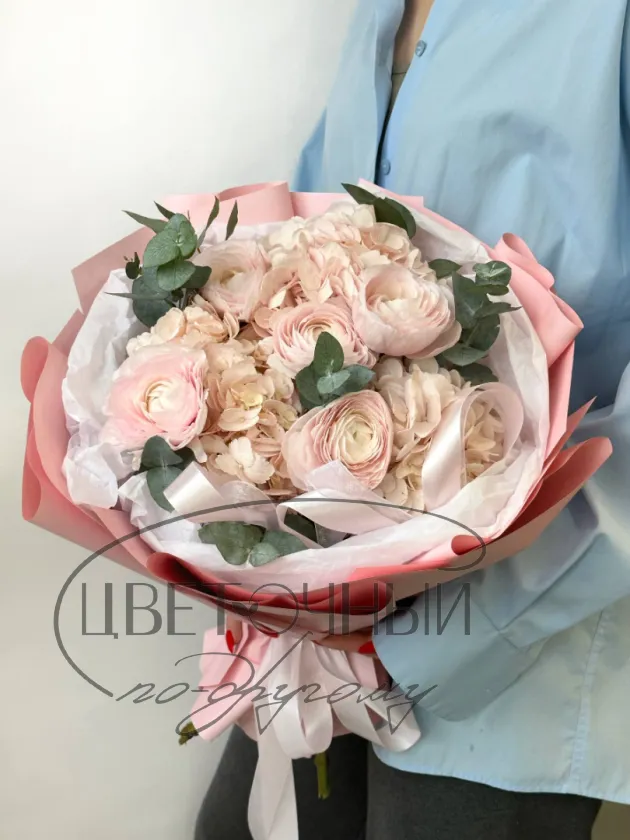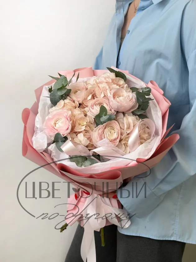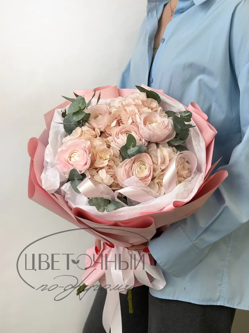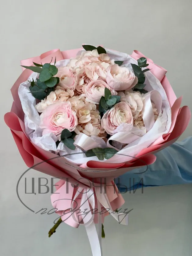Букет с розовыми ранункулюсами, гортензией и эвкалиптом