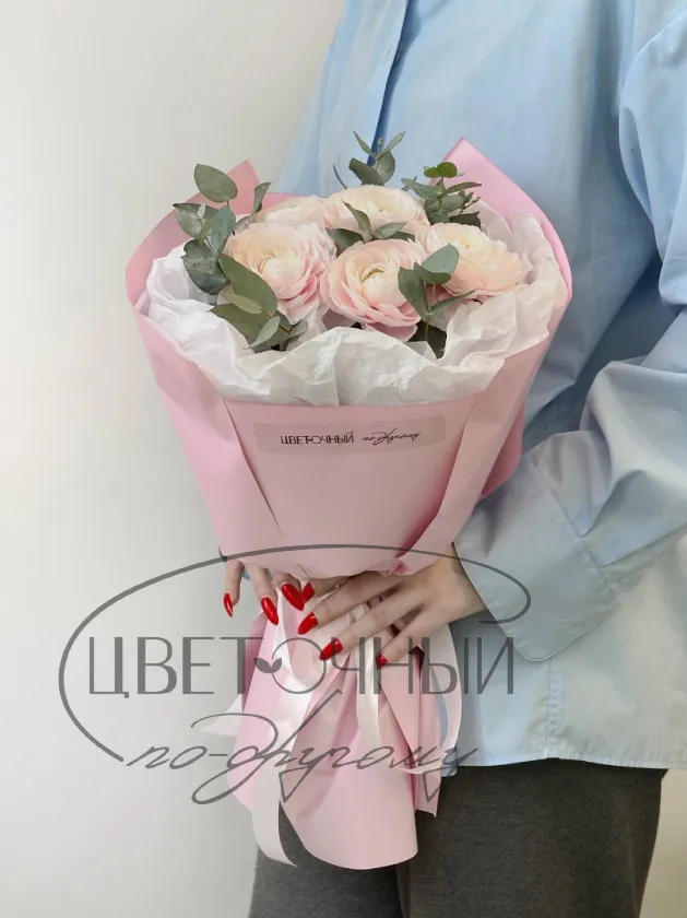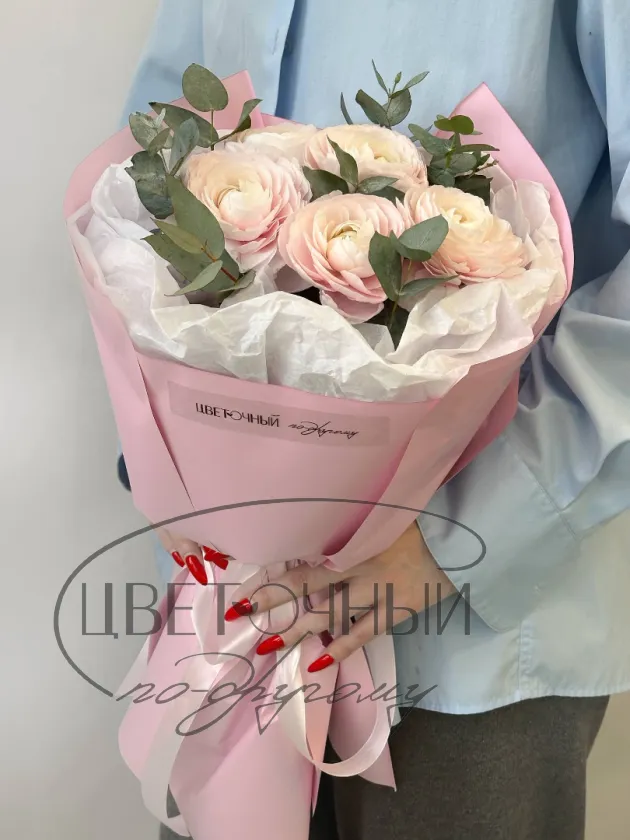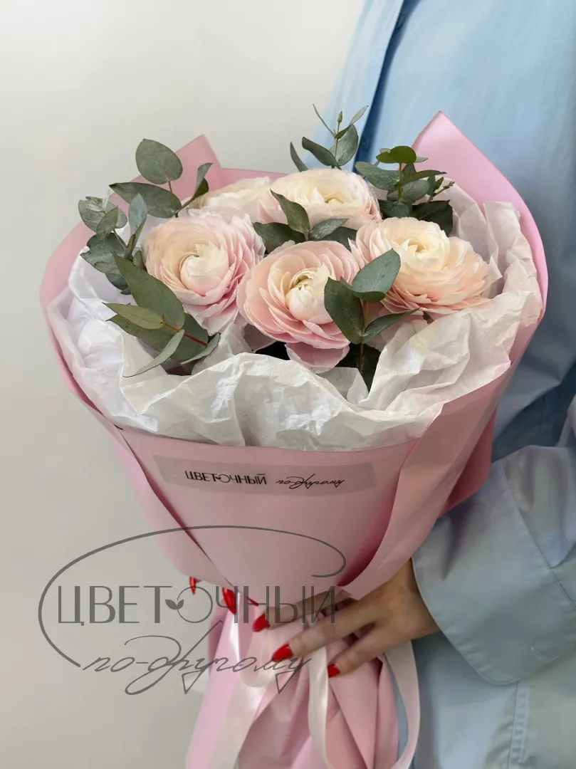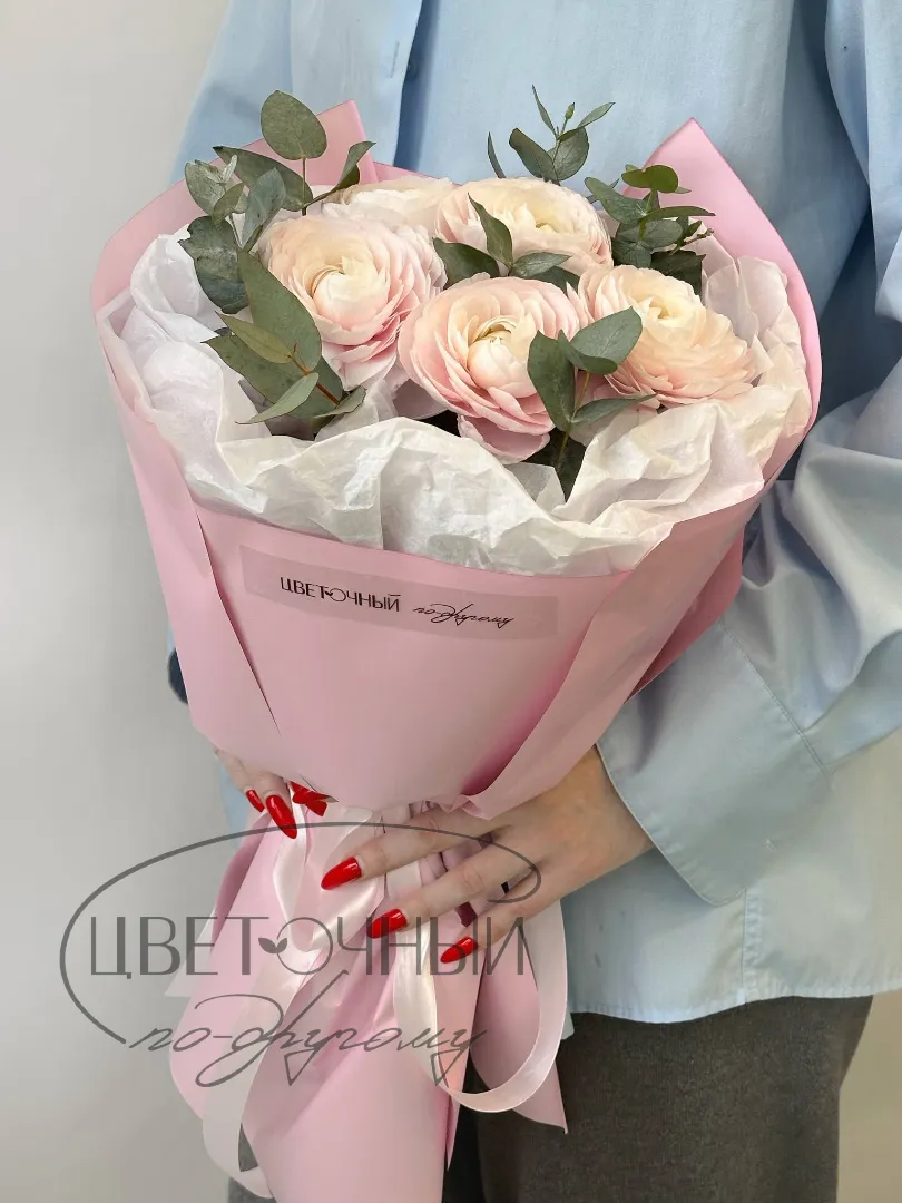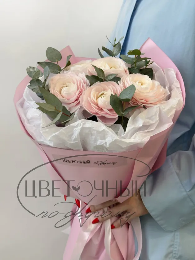 Букет нежных ранункулюсов с эвкалиптом
