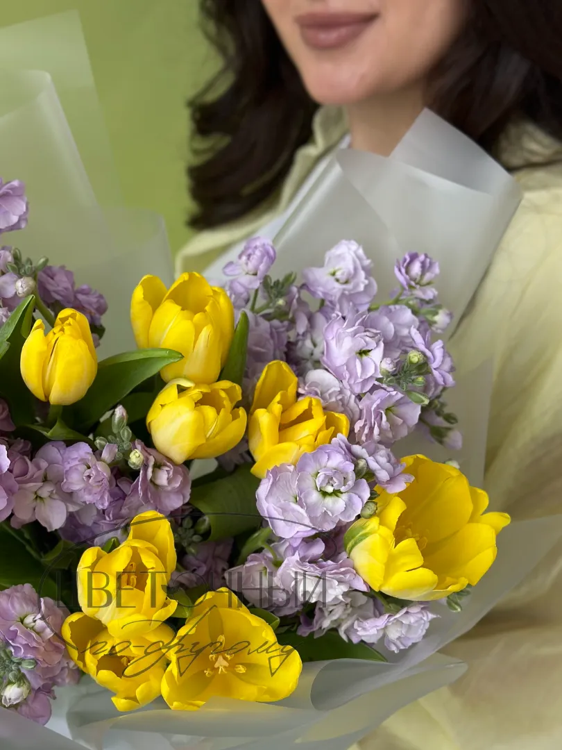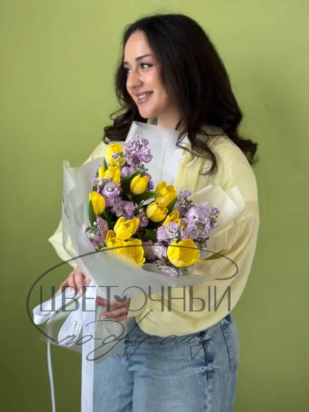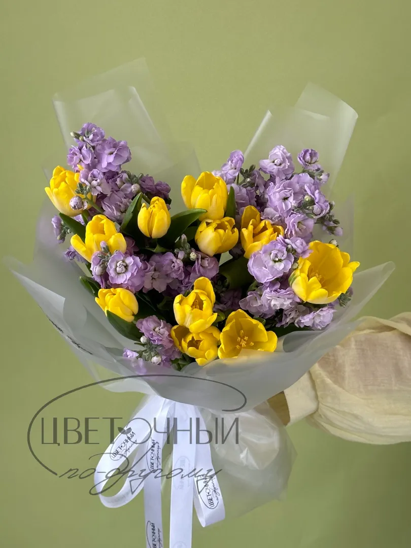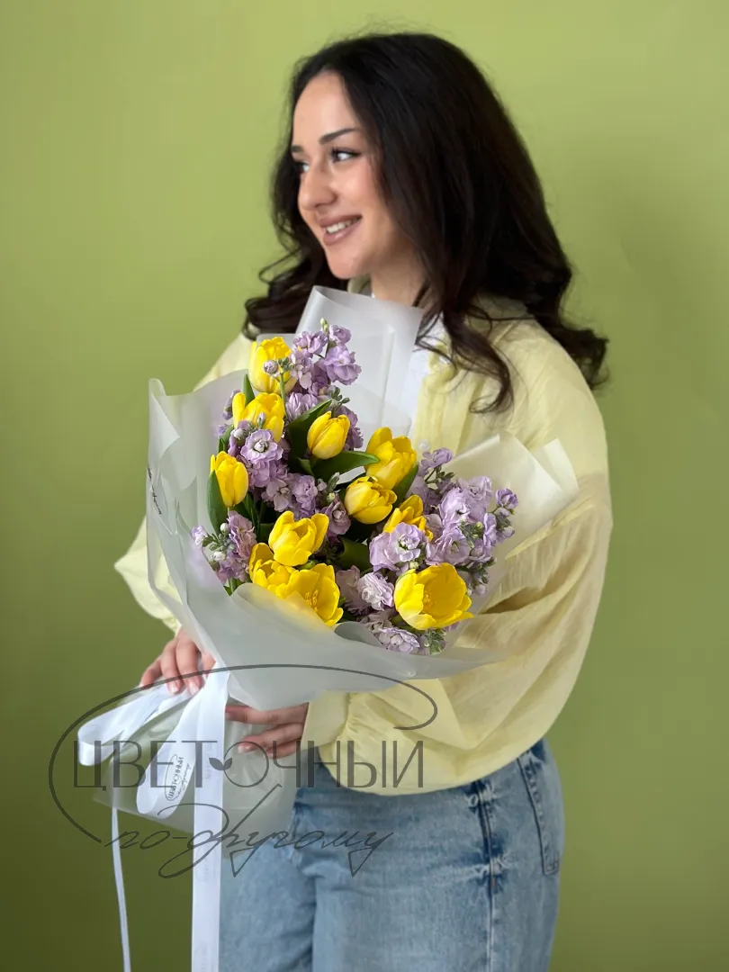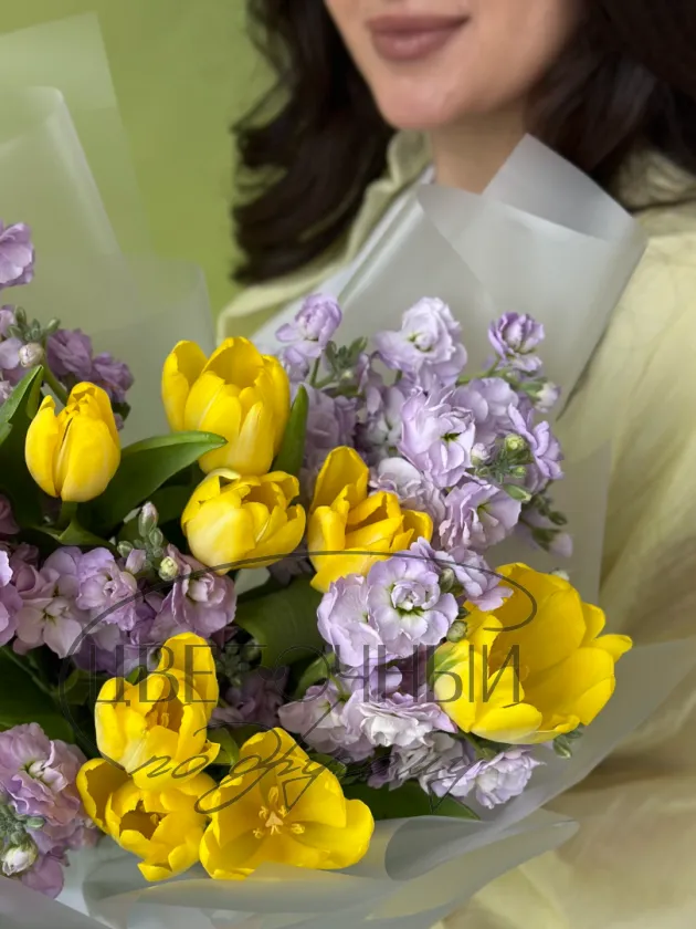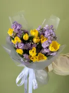 Букет из желтых тюльпанов и лавандовой маттиолы