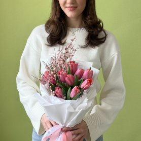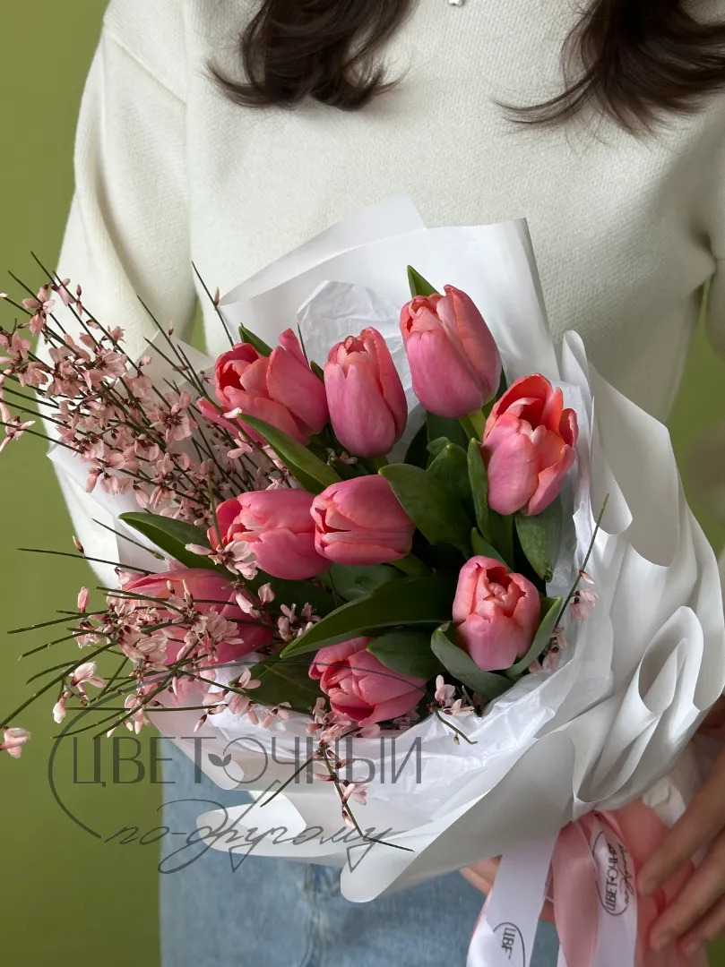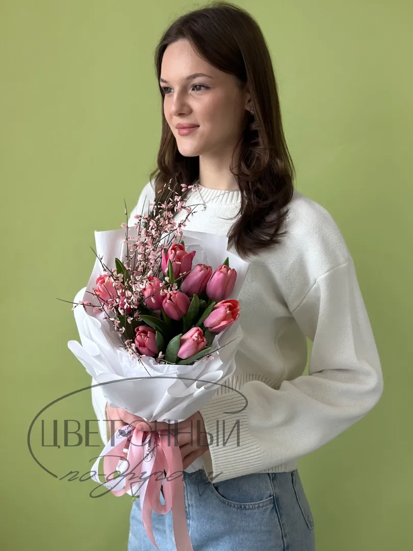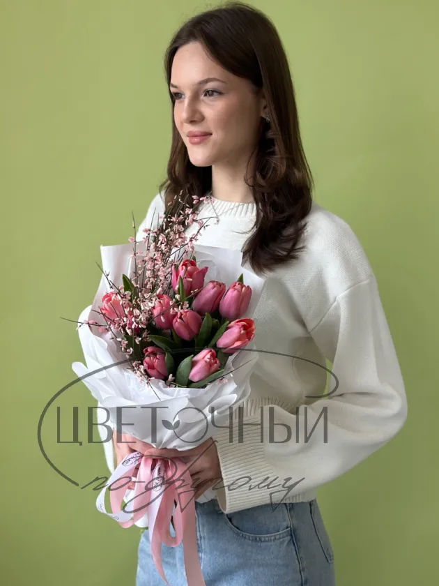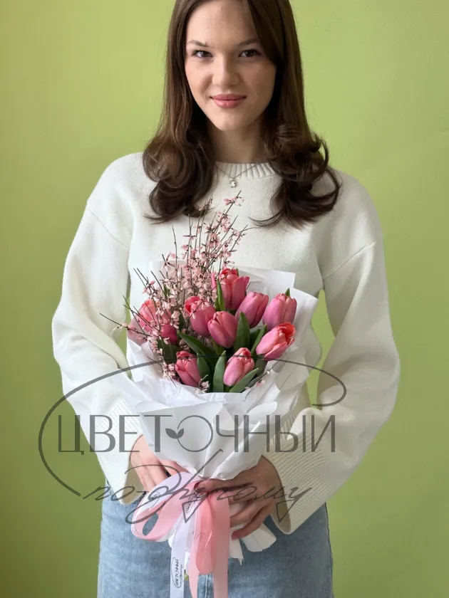 Букет «Девять розовых тюльпанов с генистой»