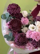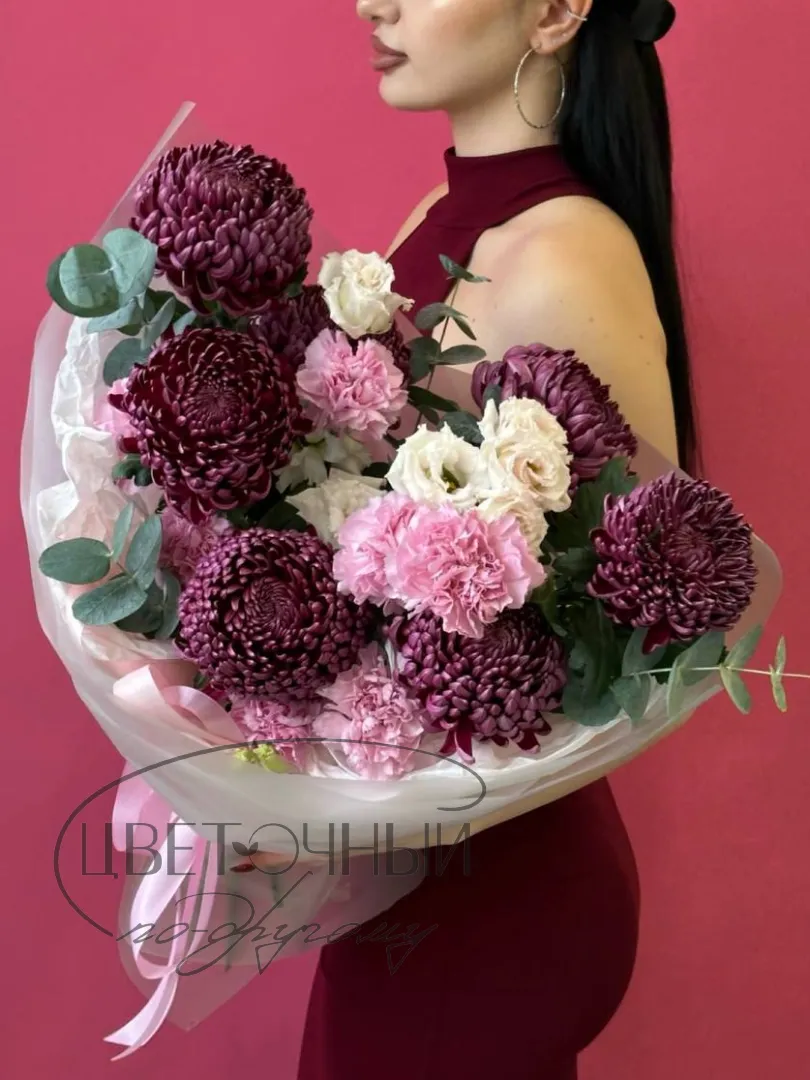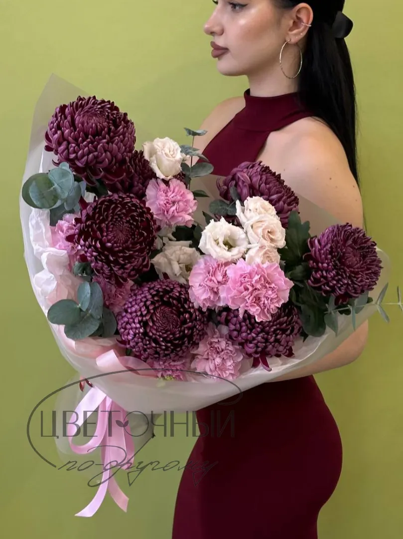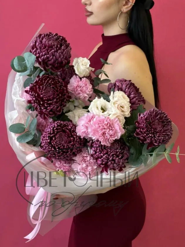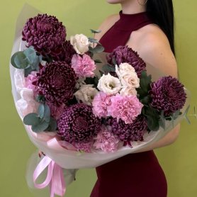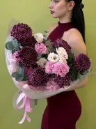 Букет «Хризантема Бигуди с нежной эустомой и диантусами»